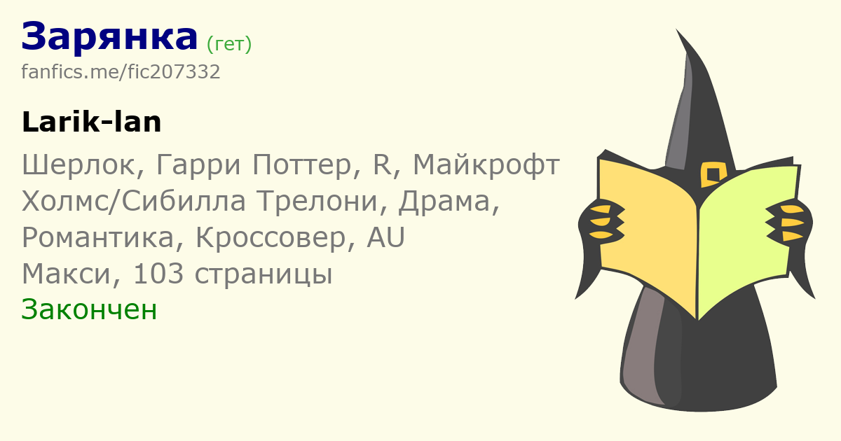 | долго лежал в ожидашках. и обложка и Сивилла - не вдохновляли. но - прям в десяточку, и Сивилла - супер, и с Эммой познакомилась (спасибо автору), и любимый Майкрофт, и не менее любимый прекрасный Северус с базукой (аж в тир захотелось сходить). и всё бодро, живенько, незатёрто. спасибо автору огромное. пошла читать вторую часть:) 3 | |